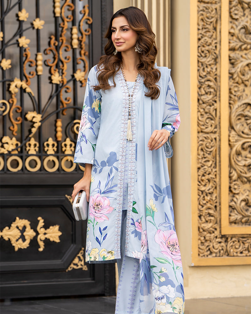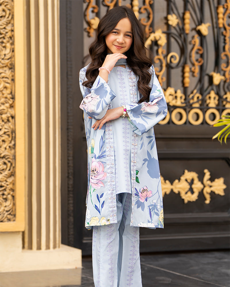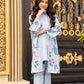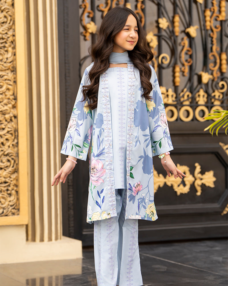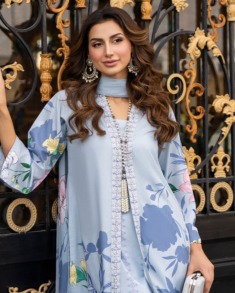 Grip silk digital printed open gown that has been expertly crafted with intricate naqshi and stone work