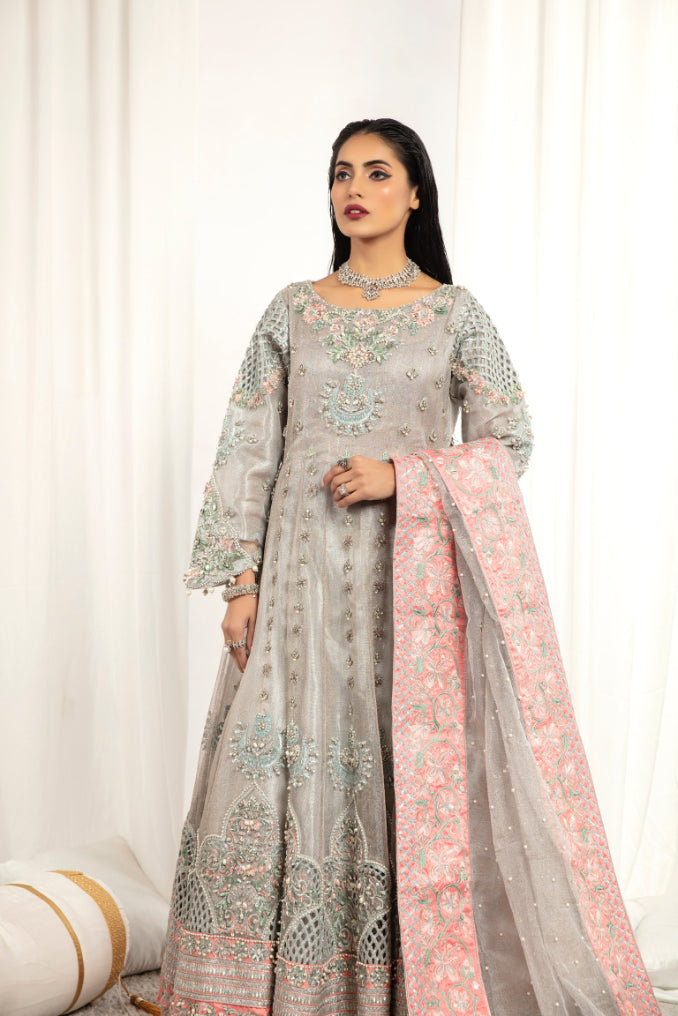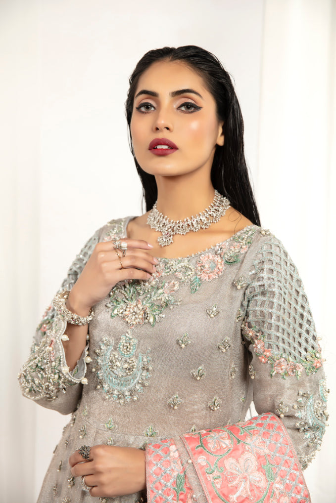 Shirt: Zari net embroidered maxi enhanced with adda work