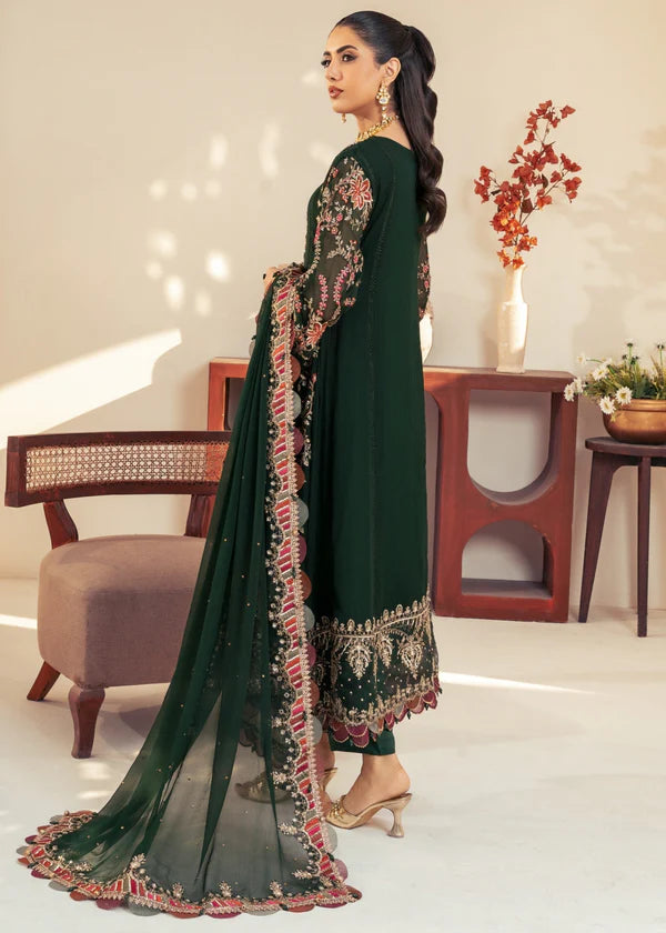 Additional Description: "1-This elegant chiffon A-line shirt is expertly crafted with intricate hand-embroidered details such as naqshi sequins, crystals, and pearls. 2-The chiffon dupatta features a beautiful scalloped border and is adorned with multi-colored embroidery and sequins 3-Complete the look with the viscose trousers" *SLEEVES LINING ARE ATTACHED*