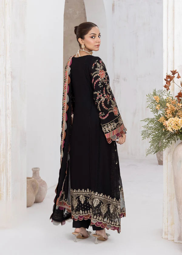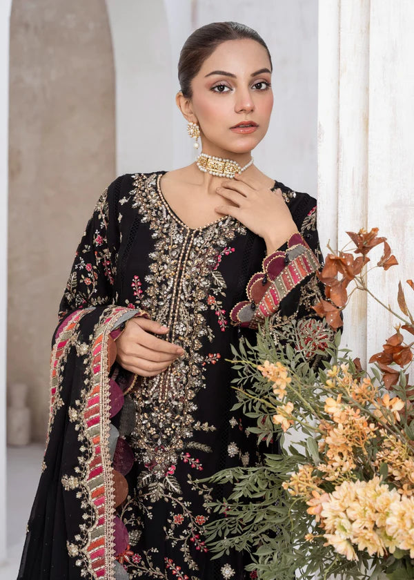 Additional Description: "1-This elegant chiffon A-line shirt is expertly crafted with intricate hand-embroidered details such as naqshi sequins, crystals, and pearls. 2-The chiffon dupatta features a beautiful scalloped border and is adorned with multi-colored embroidery and sequins 3-Complete the look with the viscose trousers"