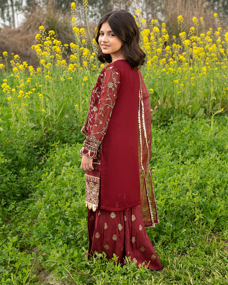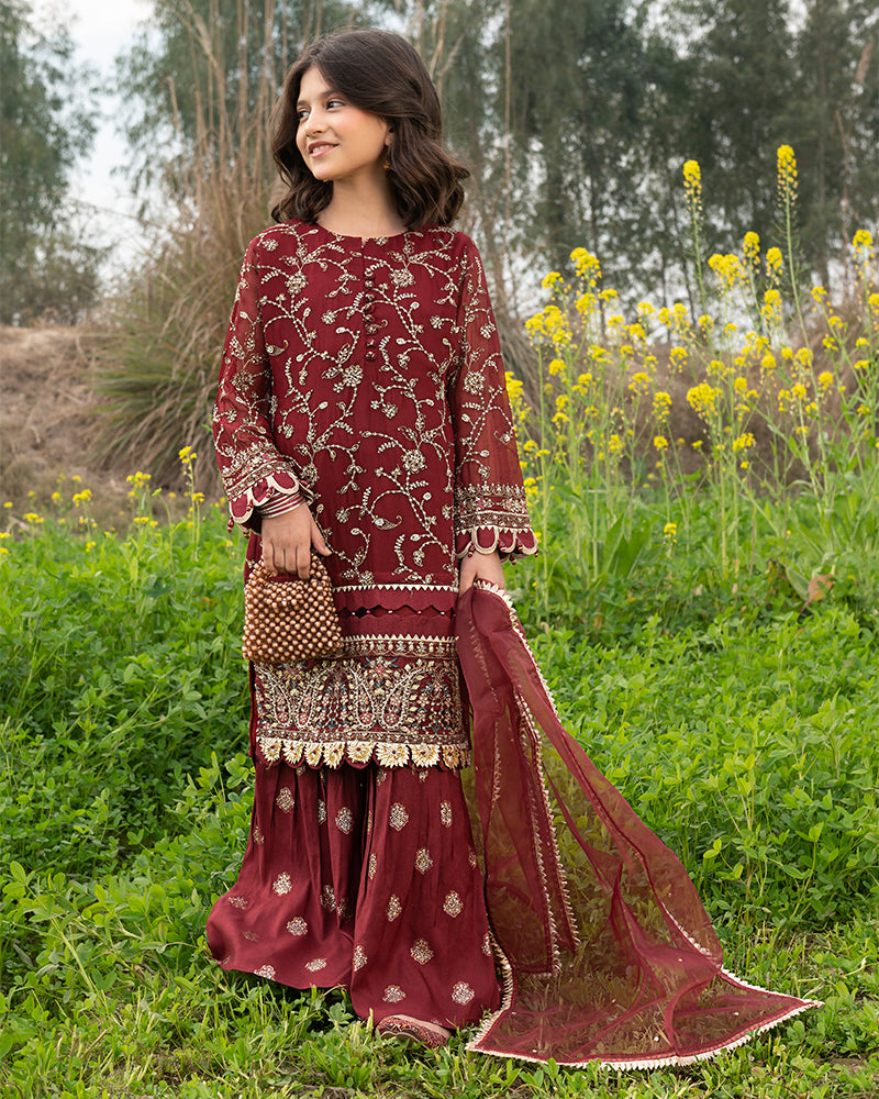 Shirt:  Chiffon shirt, meticulously crafted with intricate embroidery, sequin detailing, and delicate tassels