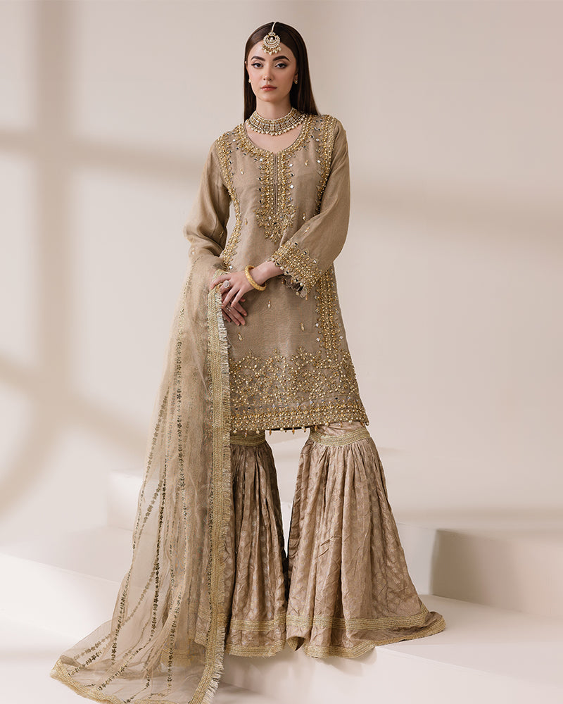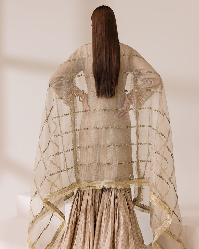 Masoori net dupatta, adorned with sparkling sequin embroidery and beautiful Banarsi laces.