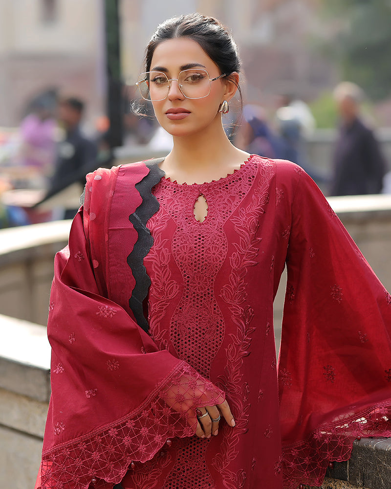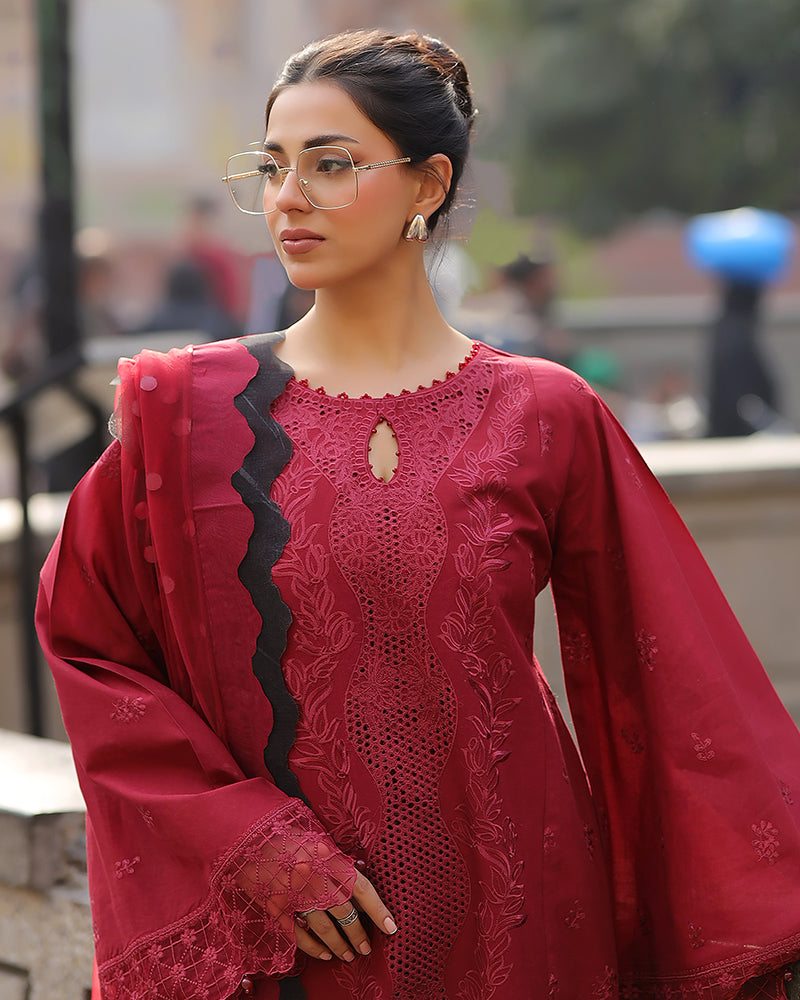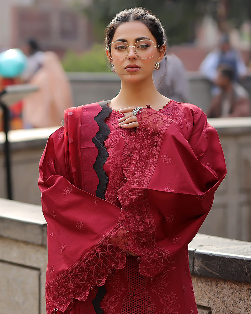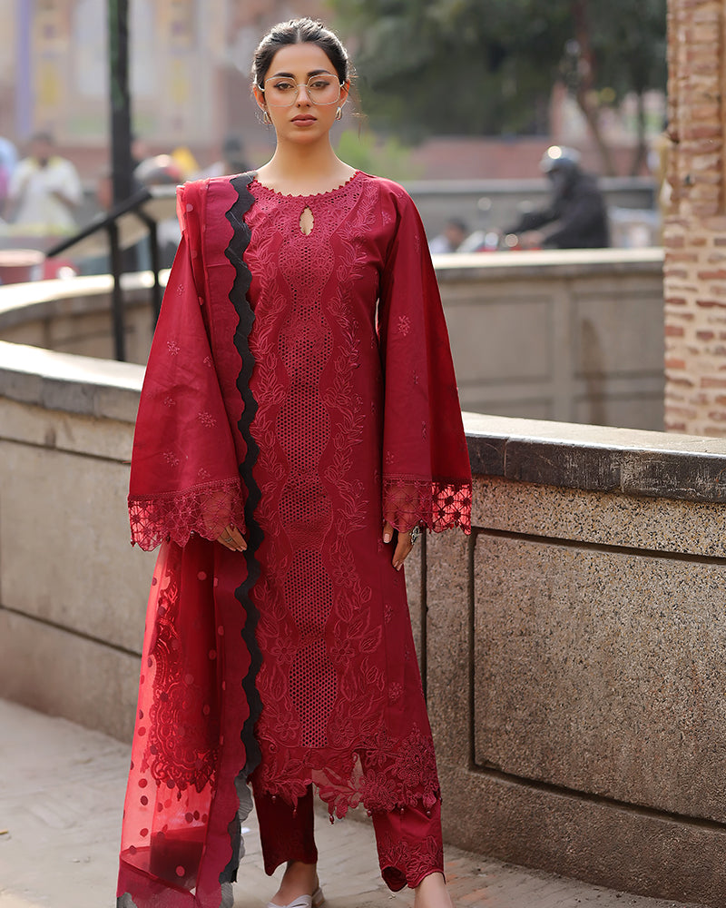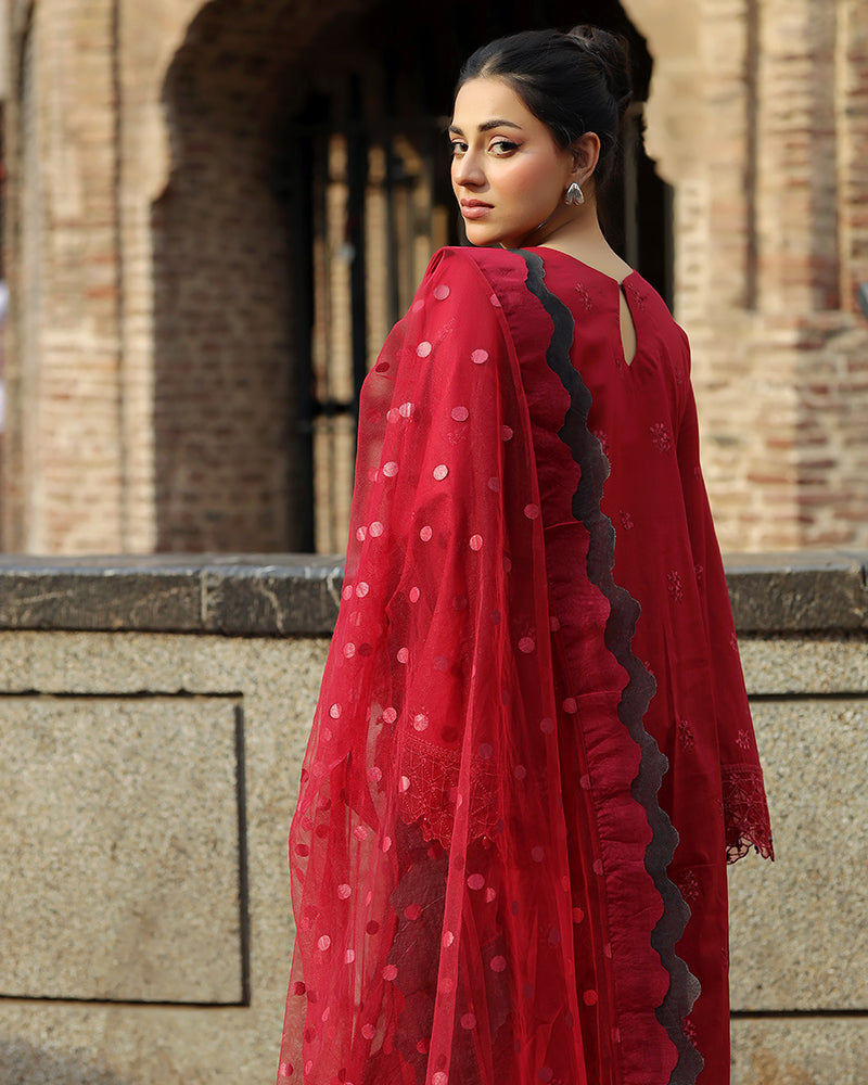Net dupatta is adorned with a beautiful screen print and scalloped borders