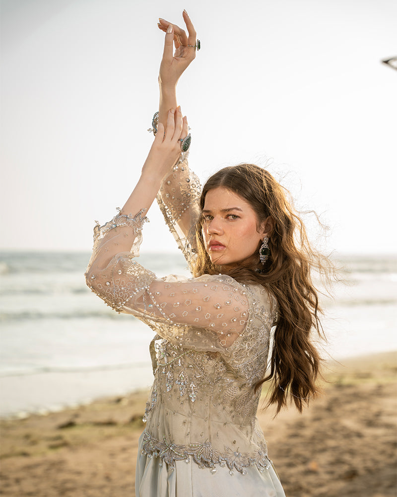 Organza jacket crafted with embroidery, featuring cutdana, naqshi, and pearl work, along with diamantes and sequins