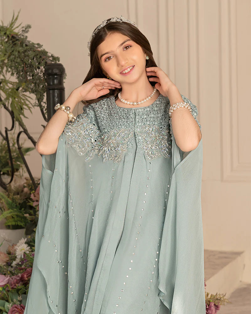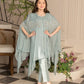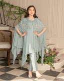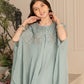 Chiffon chikankari cape, adorned with intricate handcrafted embellishments and dazzling mukesh work. Don't miss out on this must-have addition to your wardrobe!