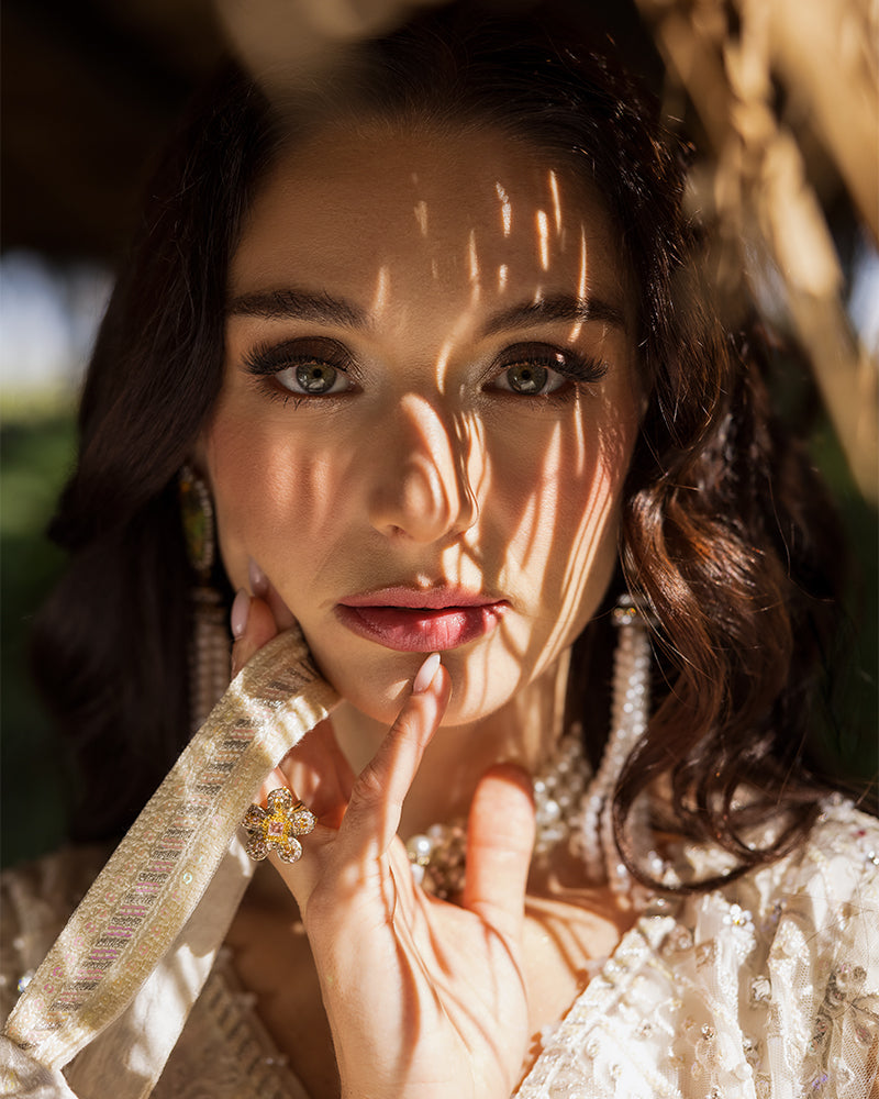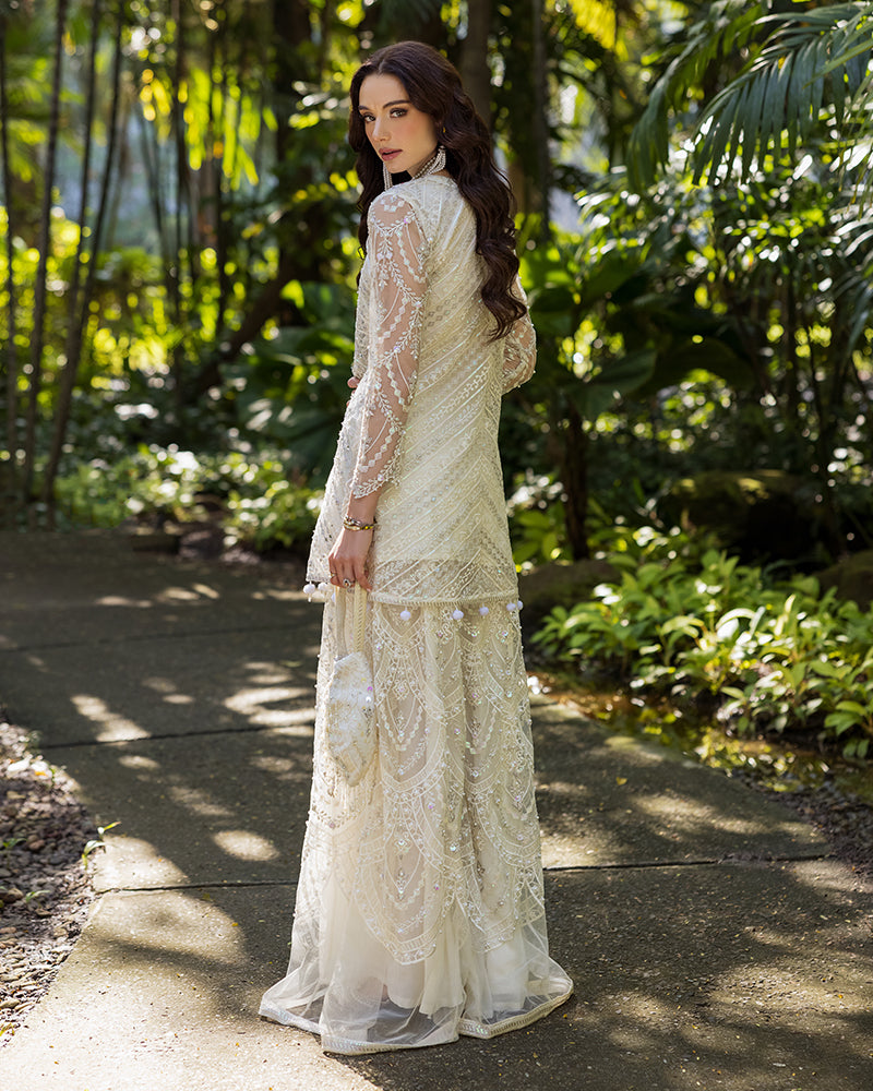 Paired beautifully with a net shararah, with vibrant multi-color embroidery and luxurious pearl embellishments