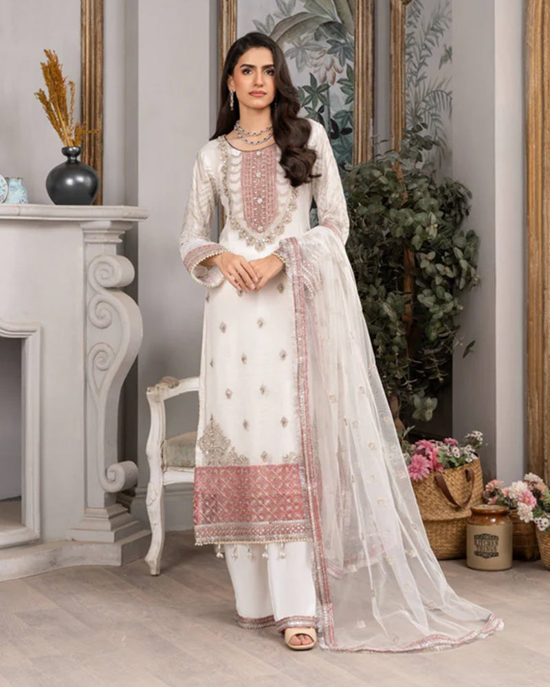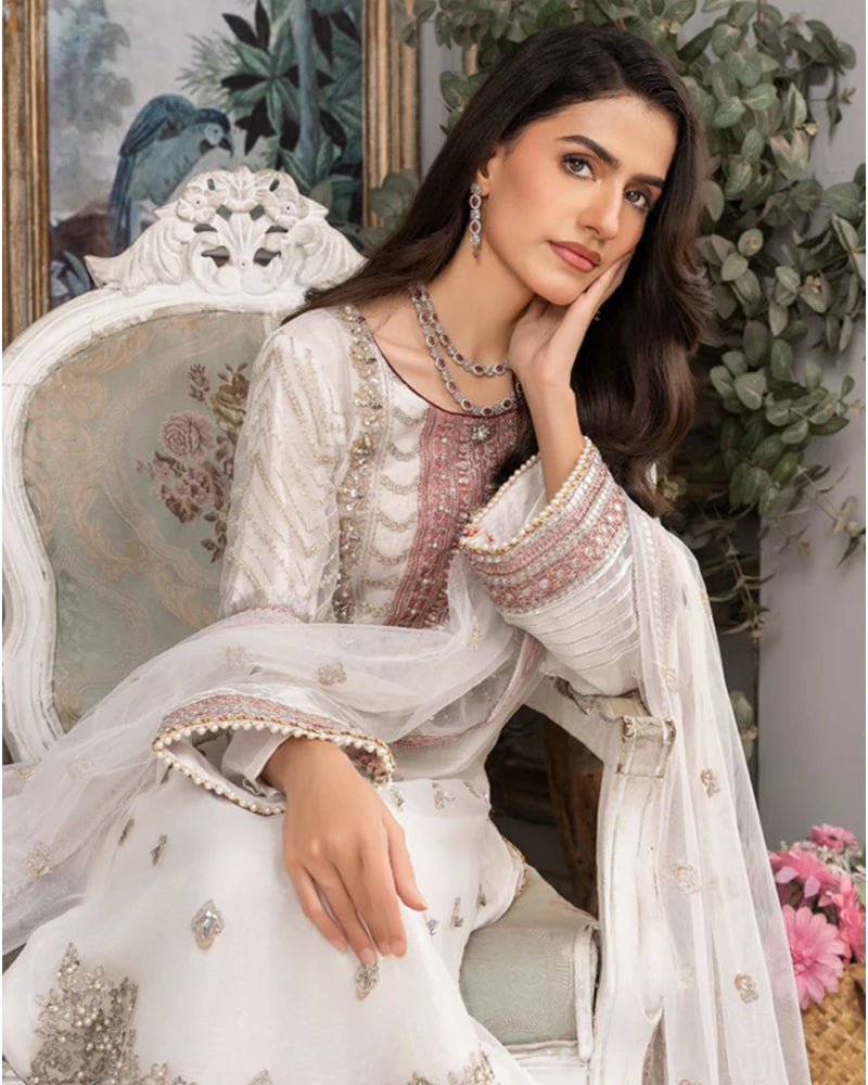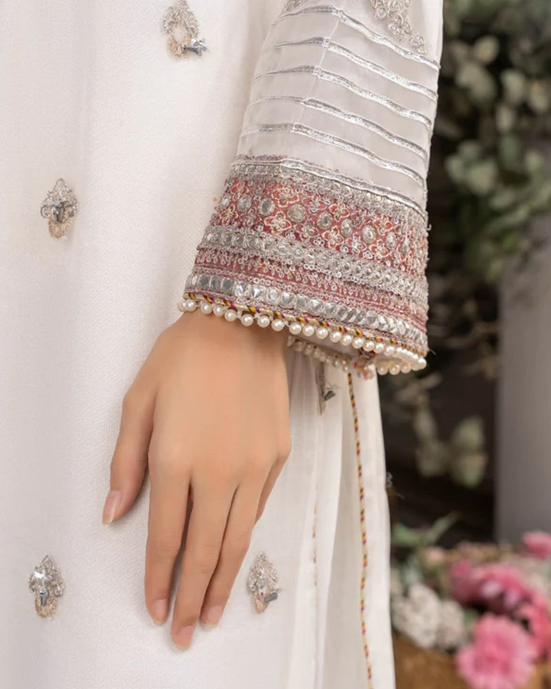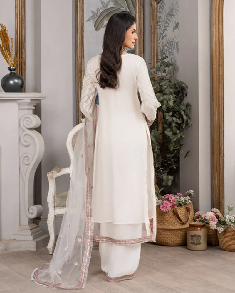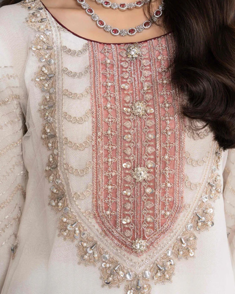 Additional Description: off white suit adda work on shirt and also tassels work on shirt. Kiran lace on doppta four sides. viscos trouser with multi head pati.