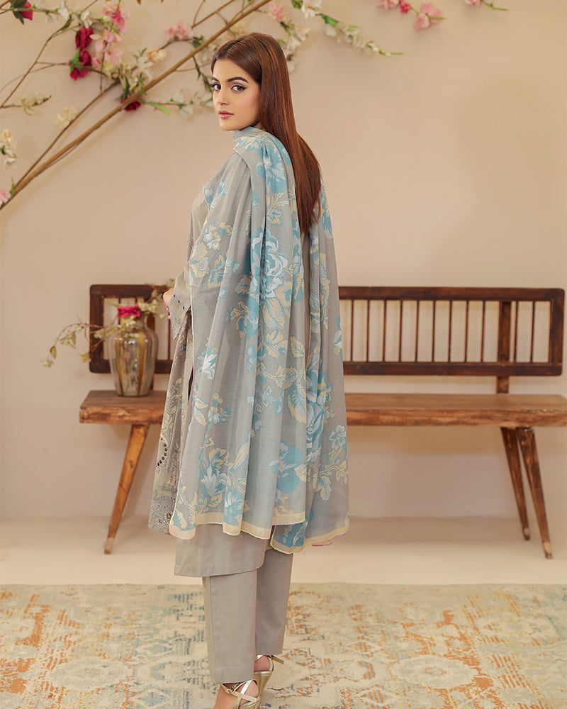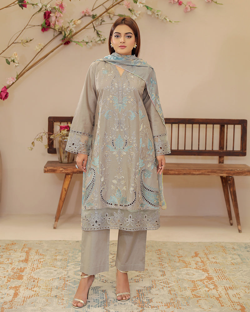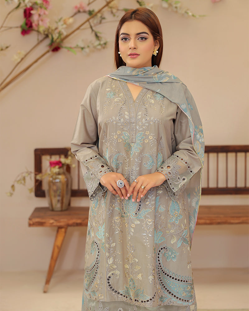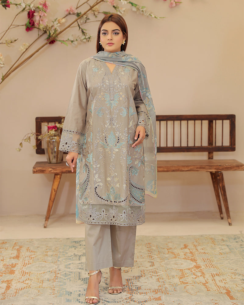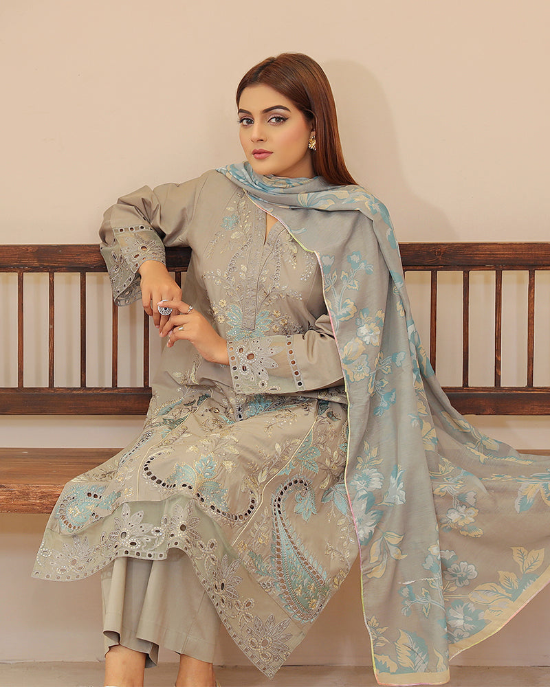 Shirt: Embroirdered Luxury Cotton fabric shirt featuring intricate sequins embroidery. Trousers: Cotton trousers. Dupatta: Monar Lawn printed Dupatta. |