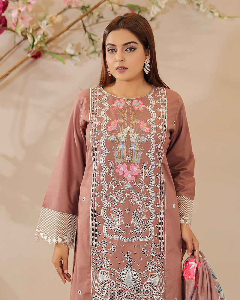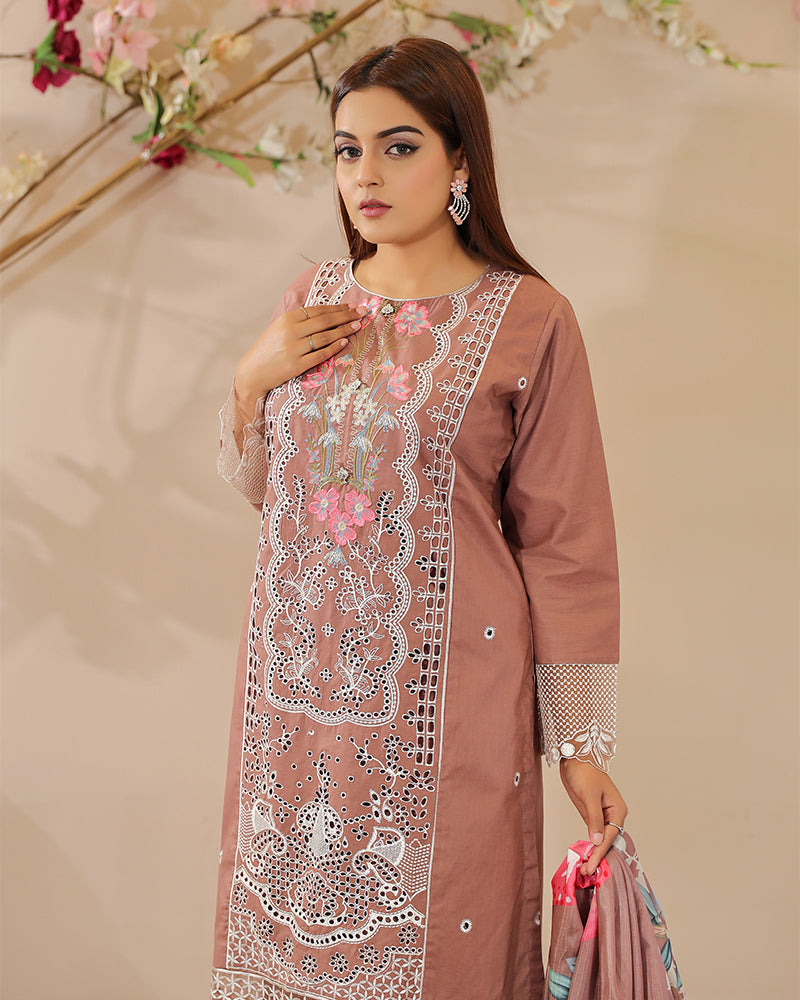 Shirt: Embroirdered Luxury Cotton fabric shirt featuring intricate sequins embroidery. Trousers: Cotton trousers. Dupatta: Monar Lawn printed Dupatta. |
