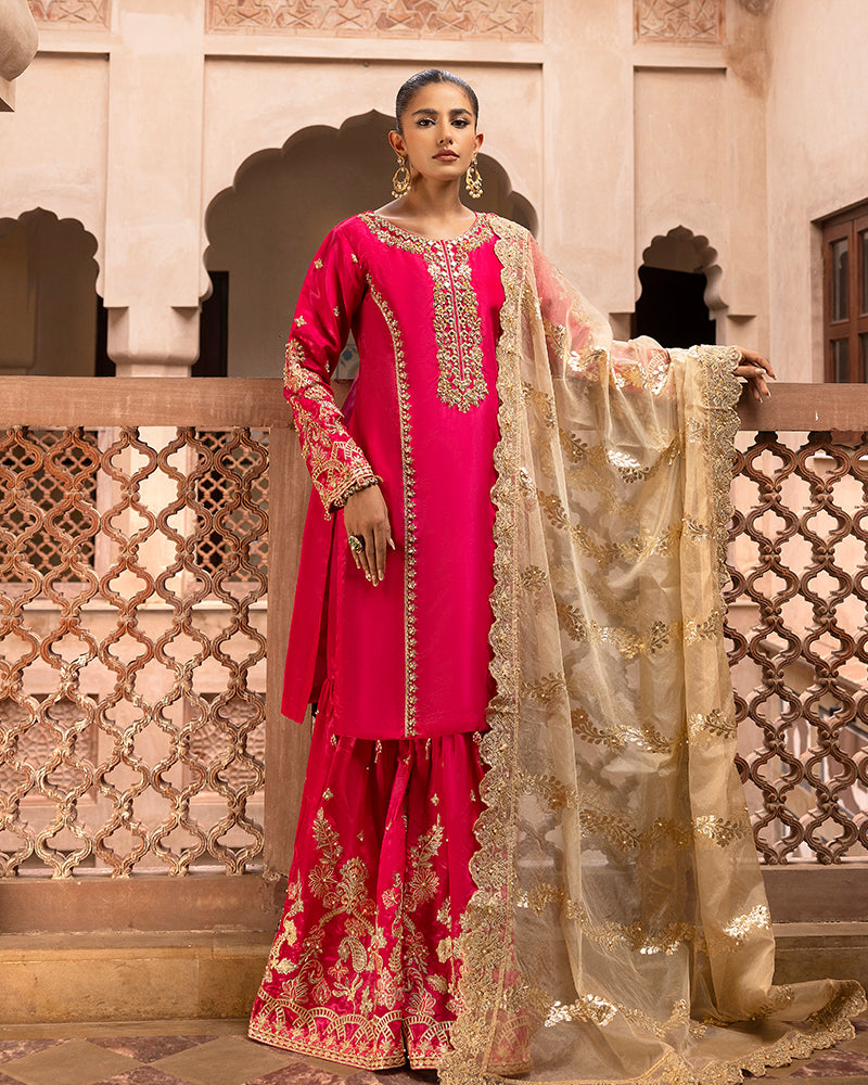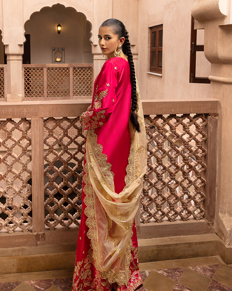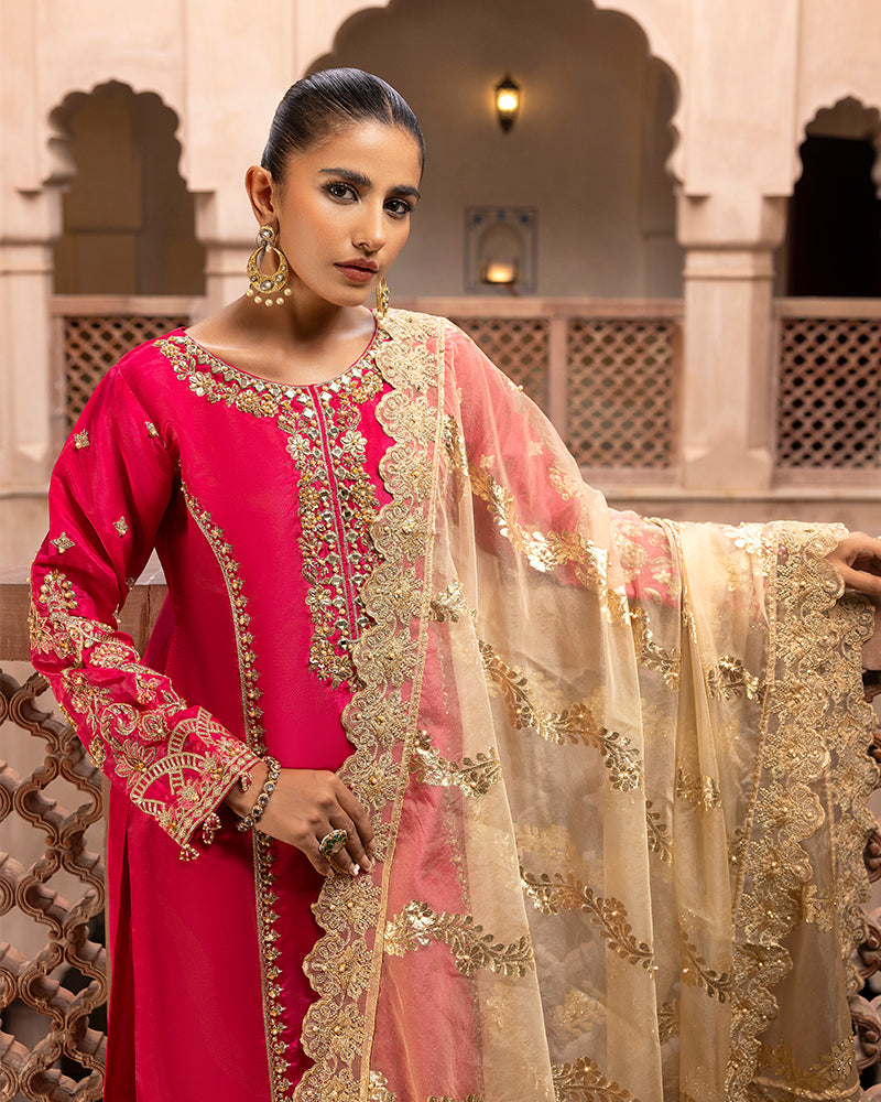Dupatta: Organza lurex embroidered dupatta is embellished with matching golden pearls
