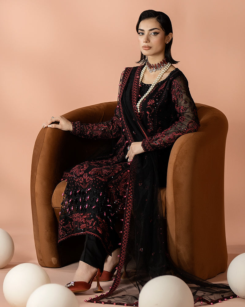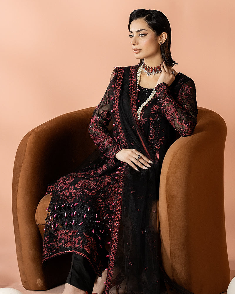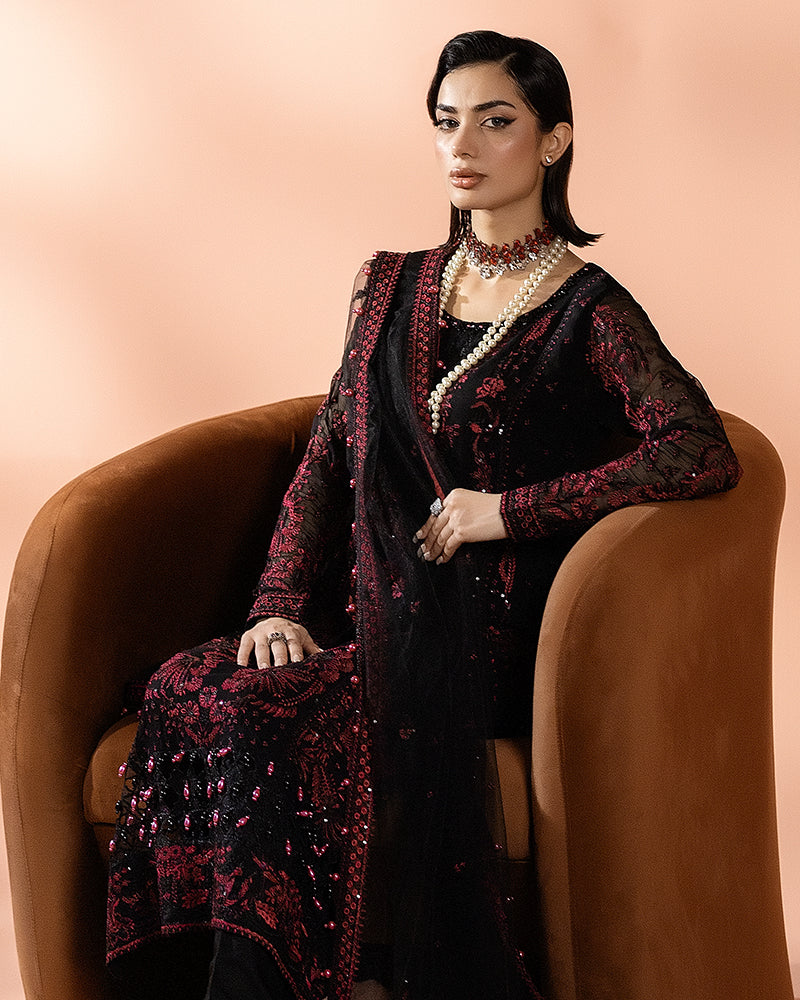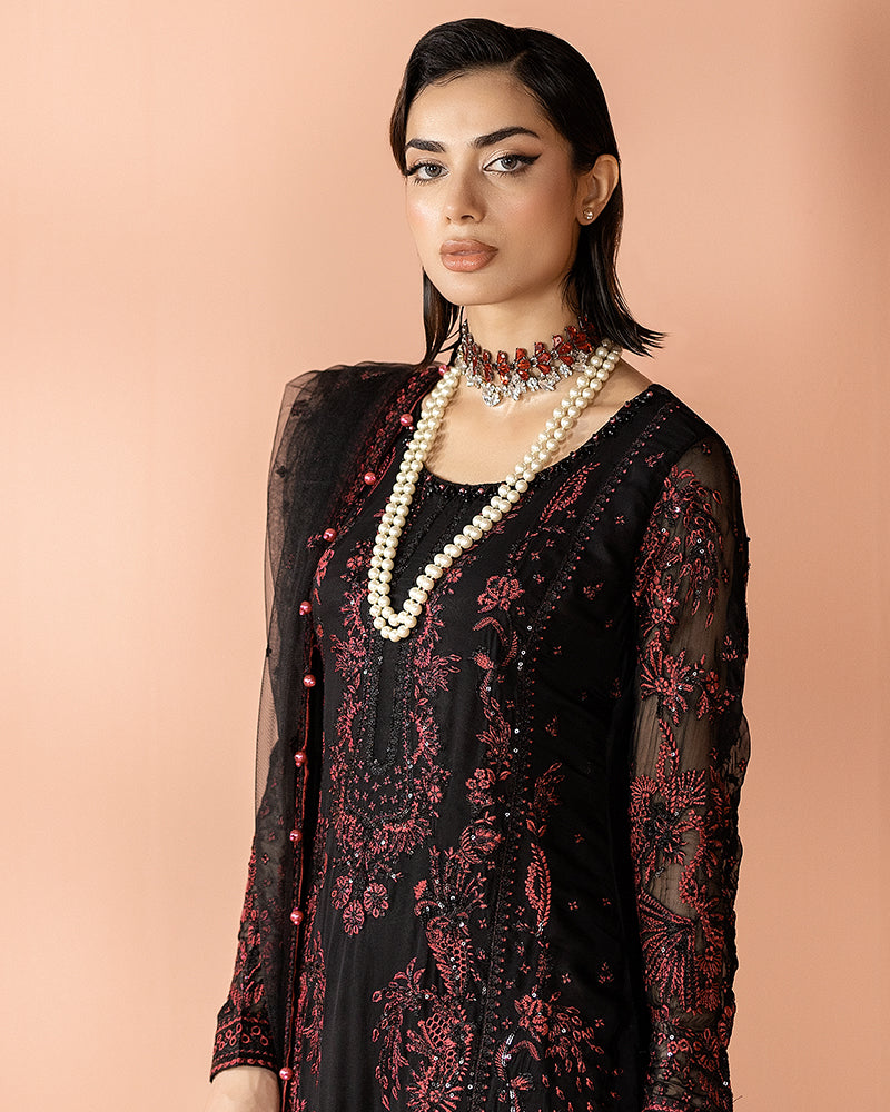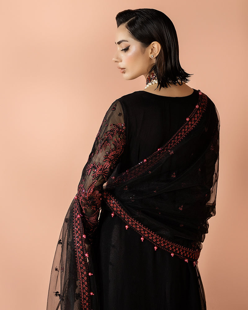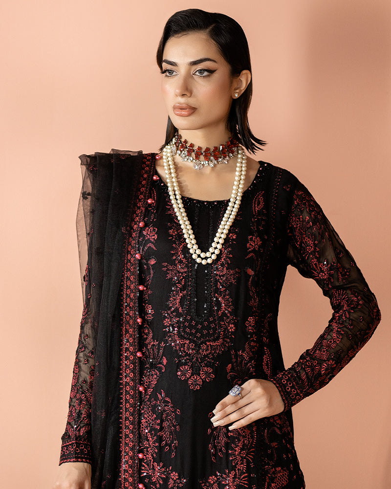 Shirt: Chiffon sequin embroidered shirt, featuring hand work on the neckline and delicate pearl embellishments.